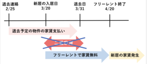 下記の通り、フリーレント物件は、入居後数ヶ月間の家賃が無料になるので、退去手続きの後でも以前住んでいた家の家賃のみで済むことが多いです。